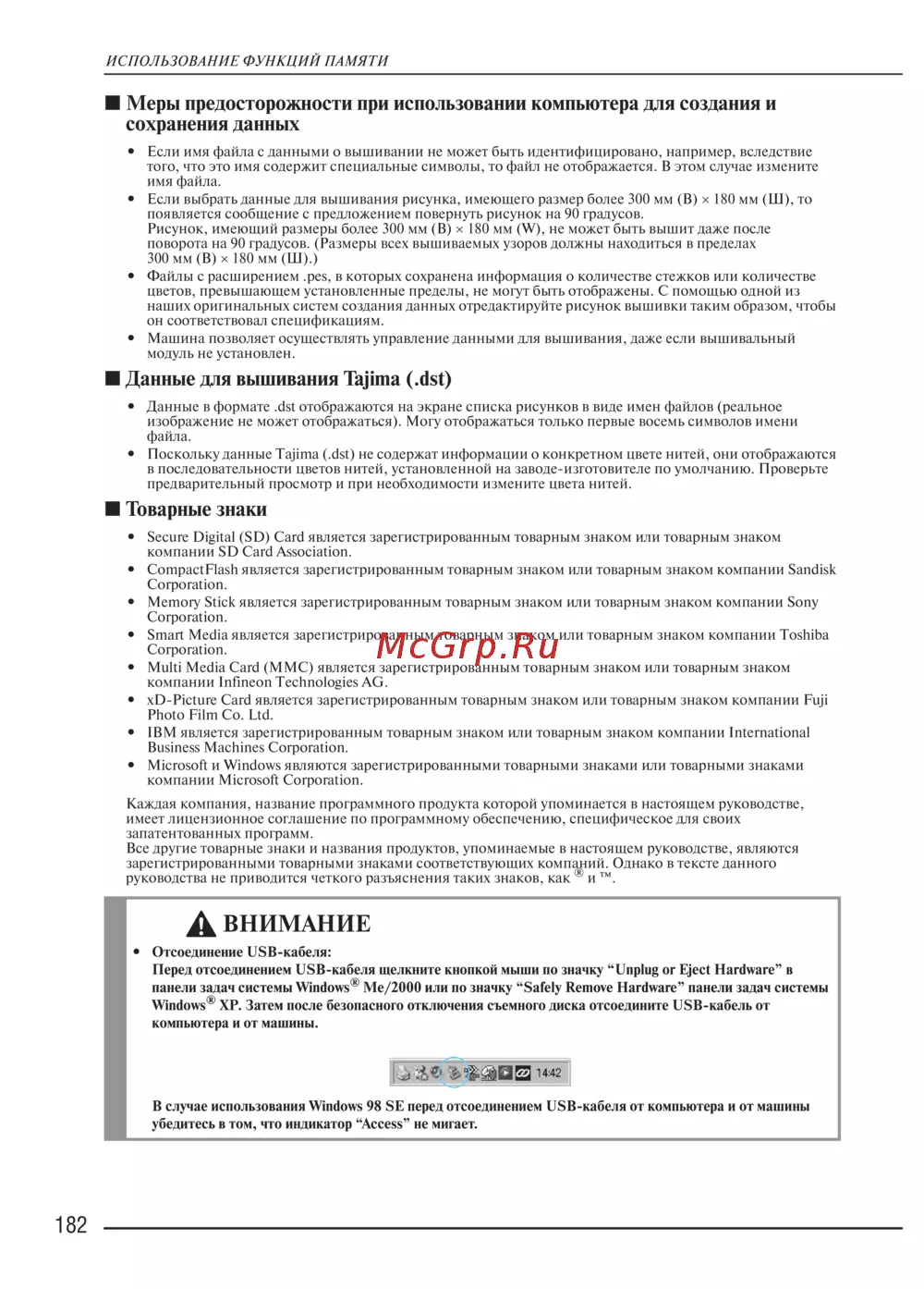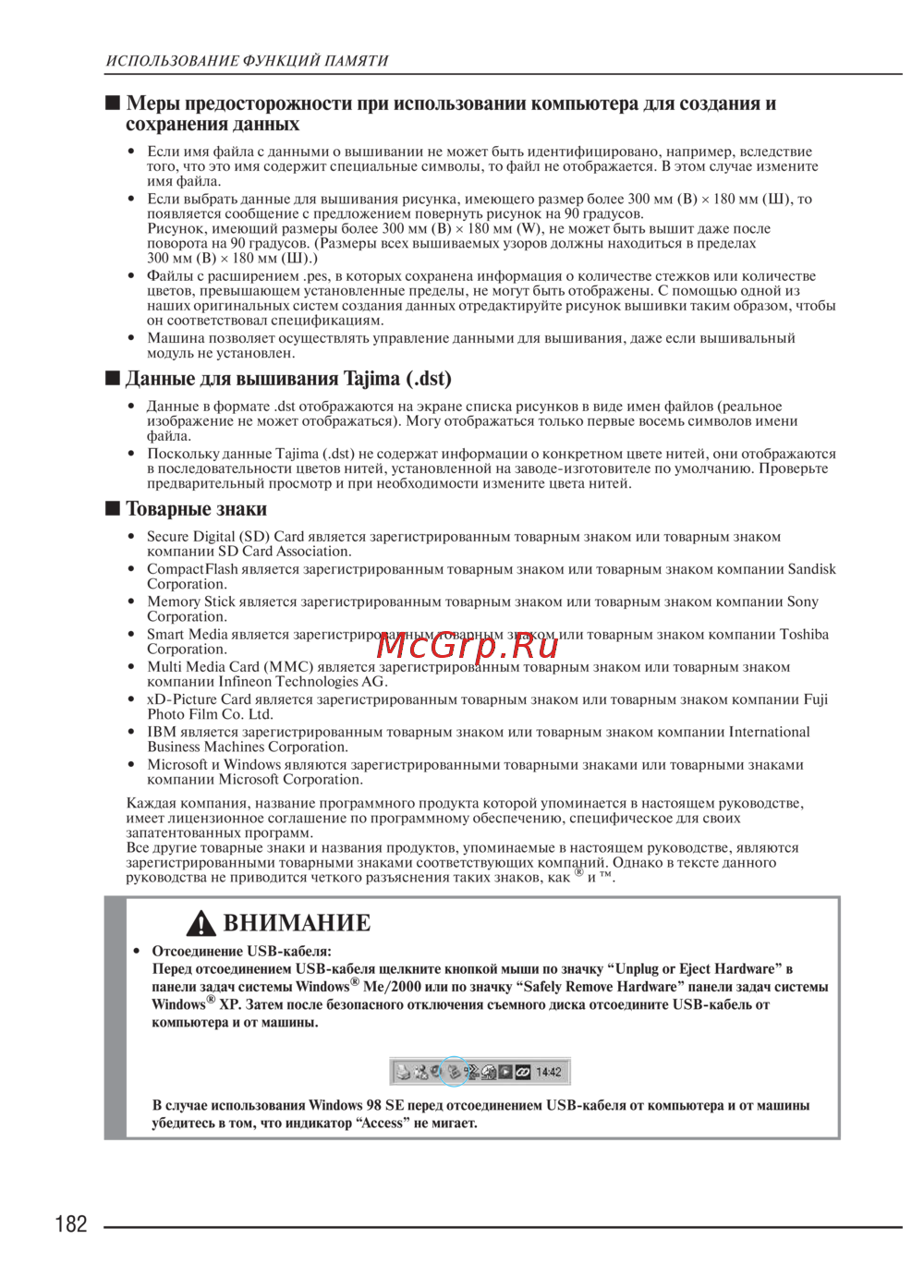 В случае использования Windows 98 SE перед отсоединением USB>кабеля от компьютера и от машины