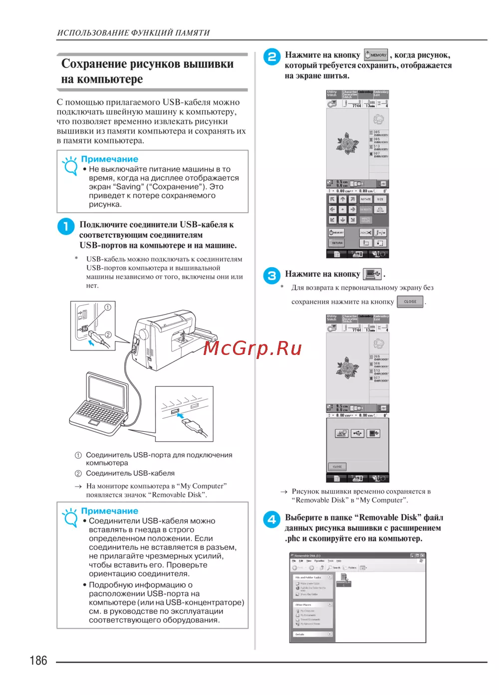 Brother INNOV-IS 4000 — как сохранить рисунки вышивки на компьютере через USB-кабель [195/274]