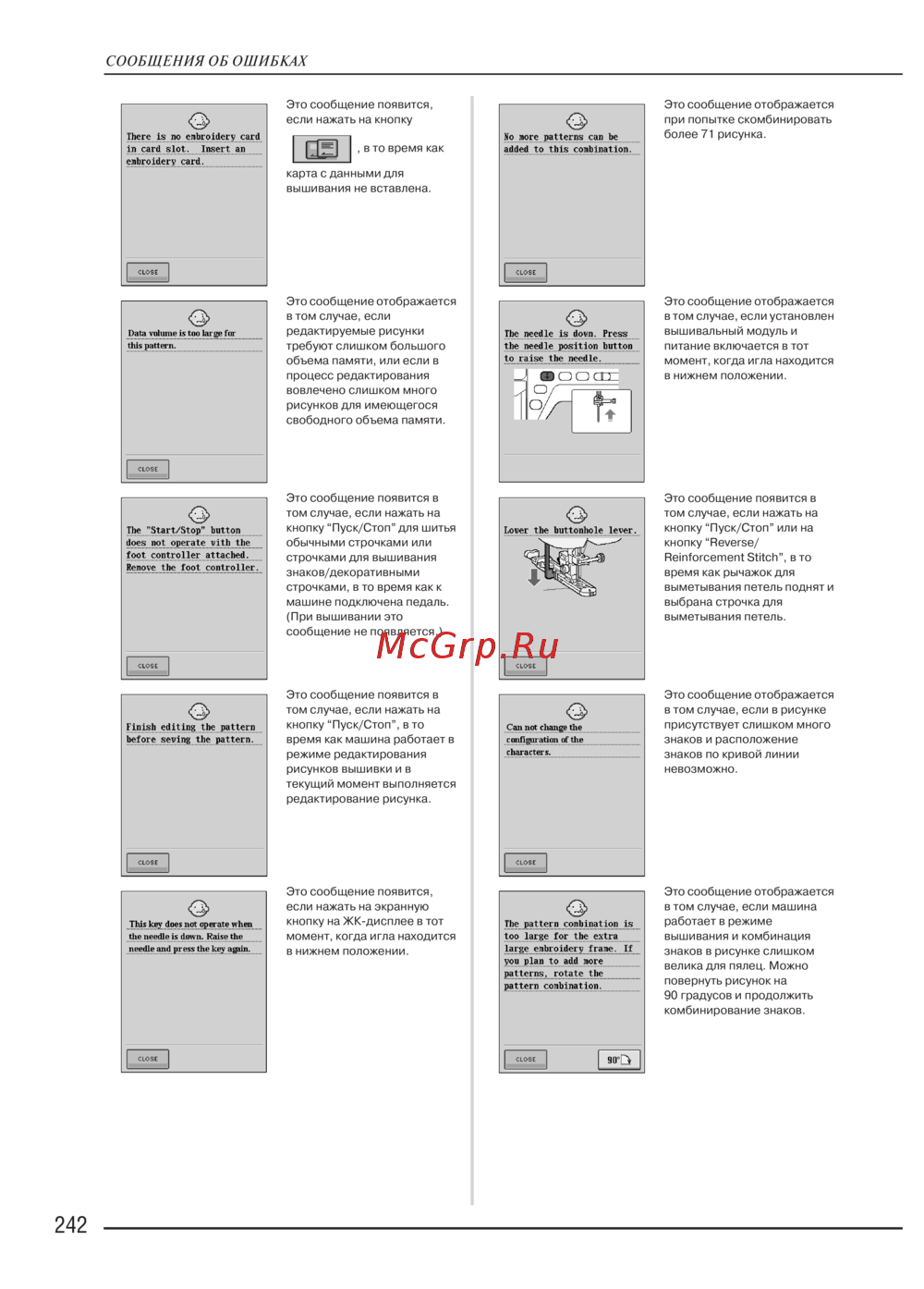 - Если нажать на кнопку пуск стоп или на кнопку reverse reinforcement stitch в то время как машина не установлена должным образом или если эксплуатация осуществляется неправильно машина не запускается при этом звучит аварийный сигнал и на жк дисплее отображается сообщение об ошибке если появляется сообщение об ошибке следуйте инструкциям представленным в этом сообщении ниже приводятся пояснения к 55 сообщениям об ошибках пользуйтесь этими пояснениями по мере необходимости если при появлении на дисплее сообщения об ошибке нажать на кнопку p.250