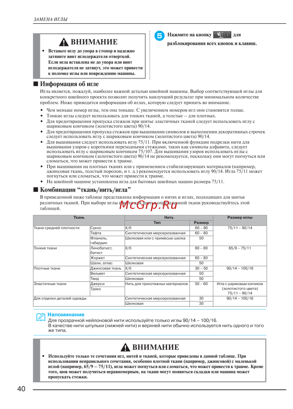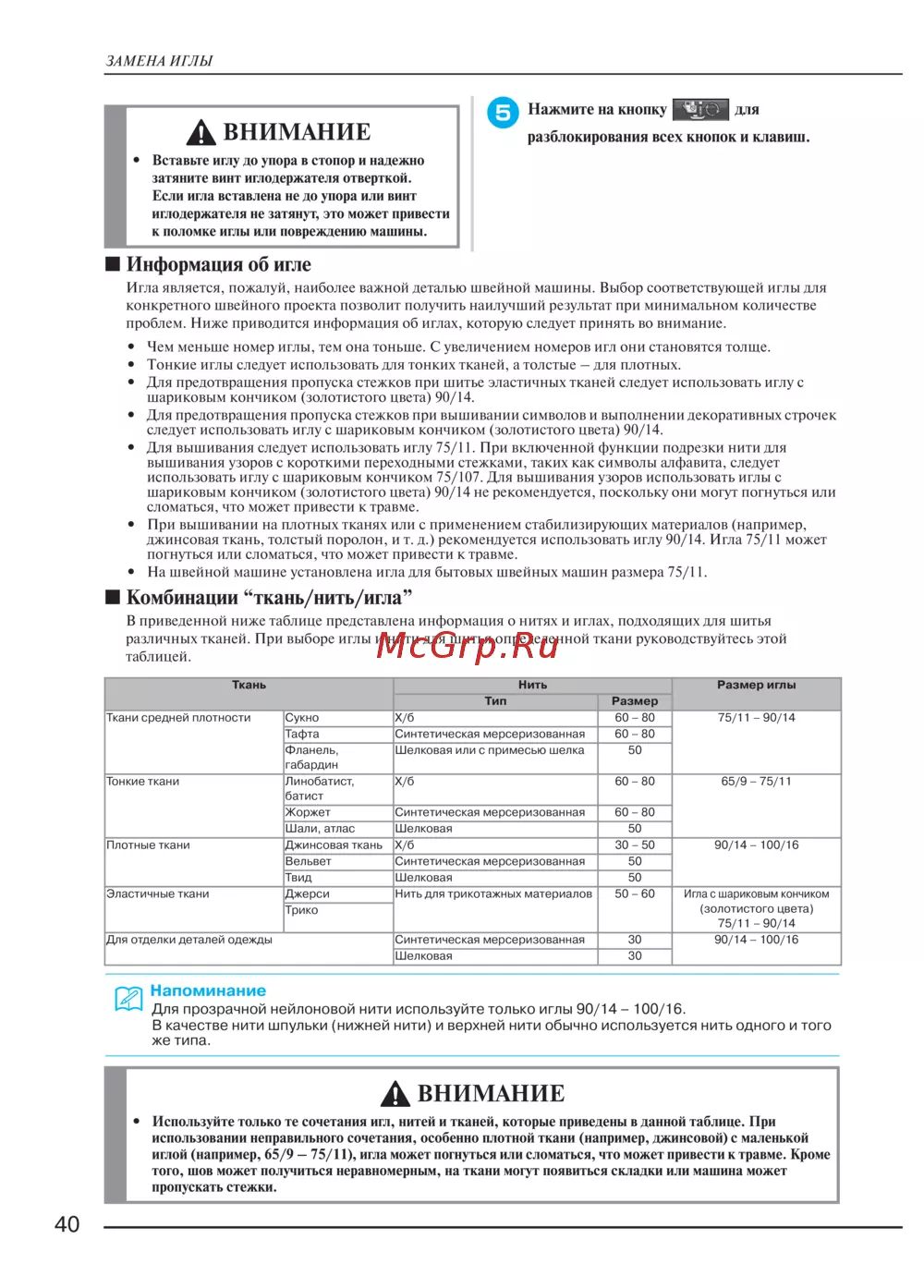 иглой (например, 65/9 – 75/11), игла может погнуться или сломаться, что может привести к травме. Кроме