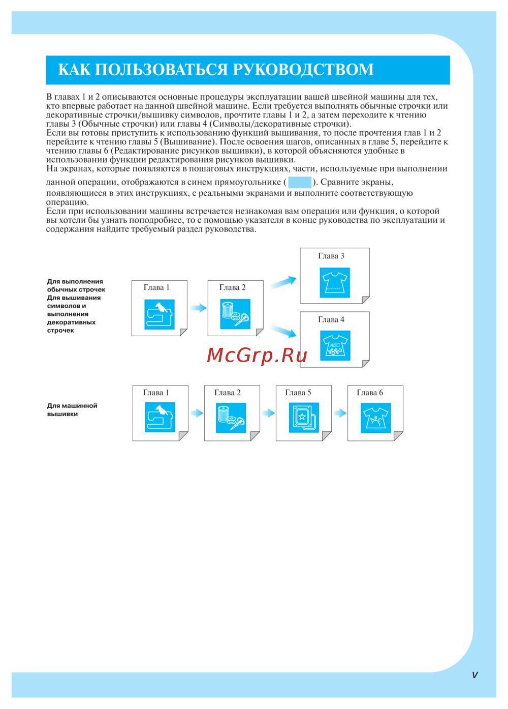 В главах 1 и 2 описываются основные процедуры эксплуатации вашей швейной машины для тех,