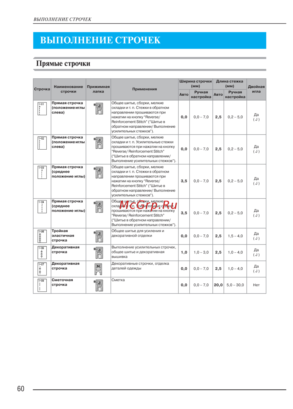- В представленной ниже таблице приводится информация о каждой обычной строчке и возможных ее применениях значения длины стежка и ширины строчки а также указывается возможность использования режима шитья двойной иглой p.260
