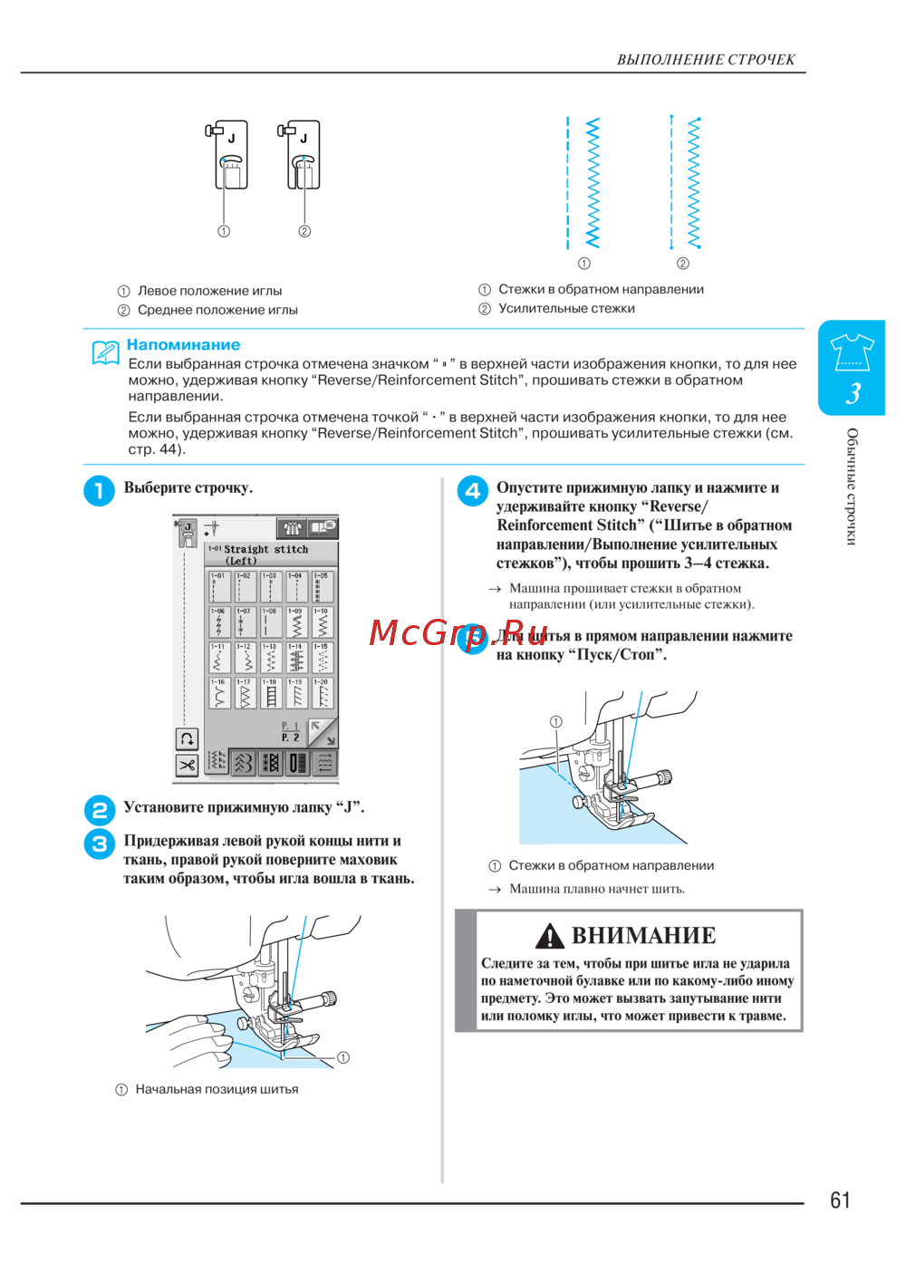 можно, удерживая кнопку “Reverse/Reinforcement Stitch”, прошивать стежки в обратном