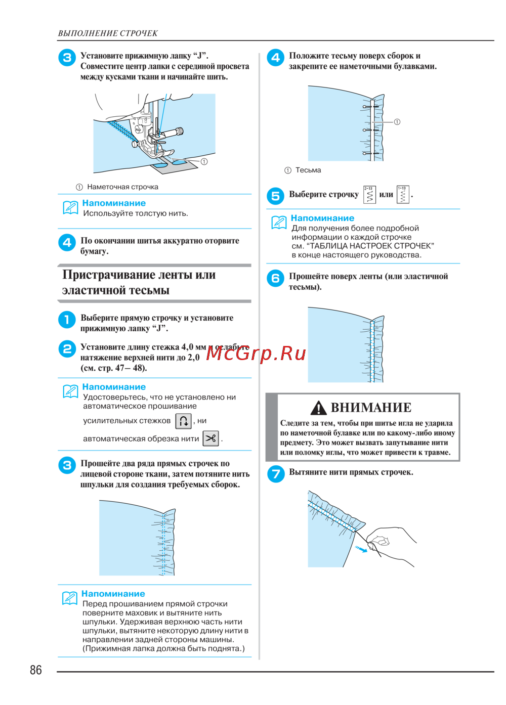 Узнайте, как правильно установить прижимную лапку и выполнить строчки на ткани. Подробные инструкции по наметочным строчкам и работе с тесьмой.