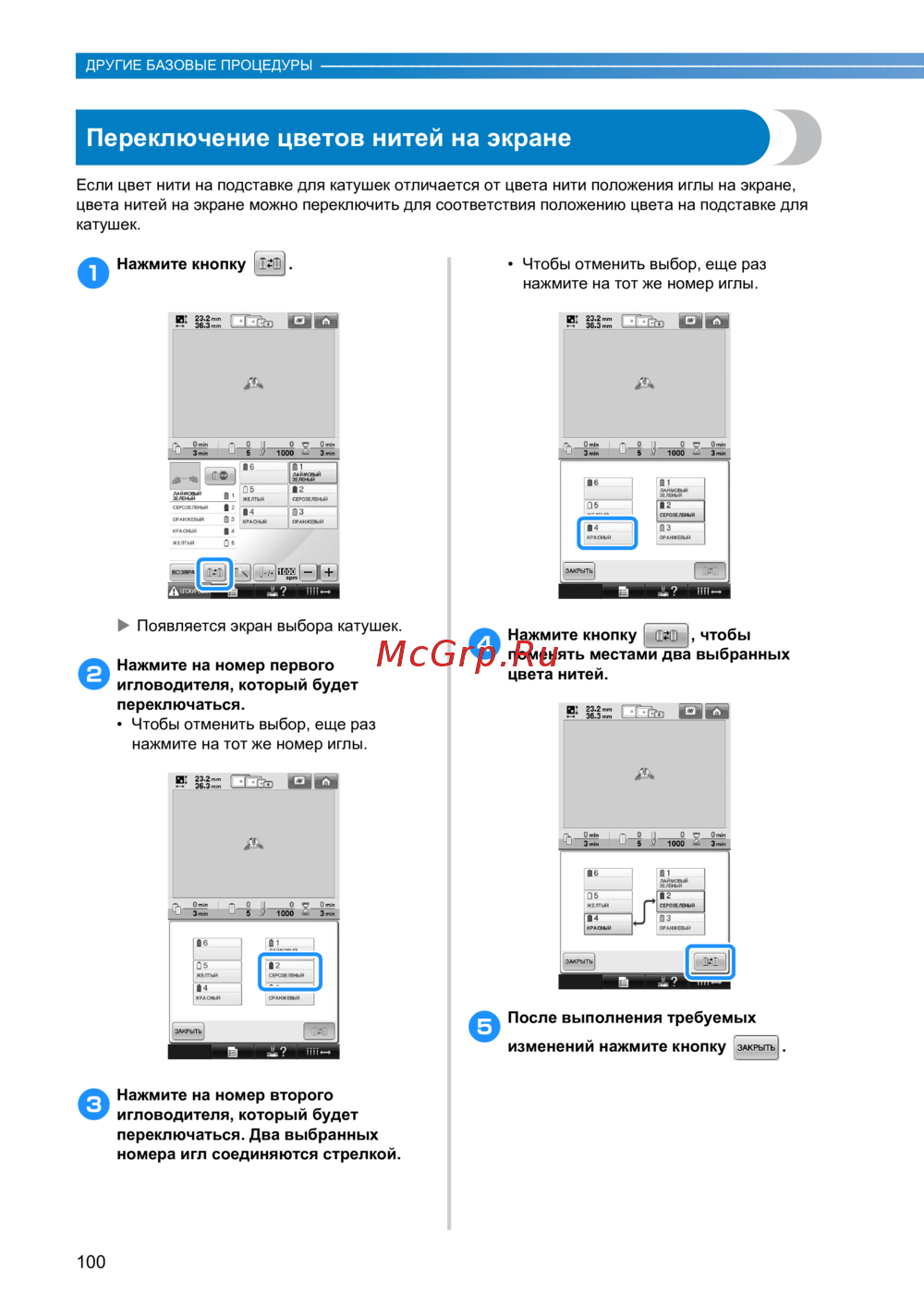 Если цвет нити на подставке для катушек отличается от цвета нити положения иглы на экране,