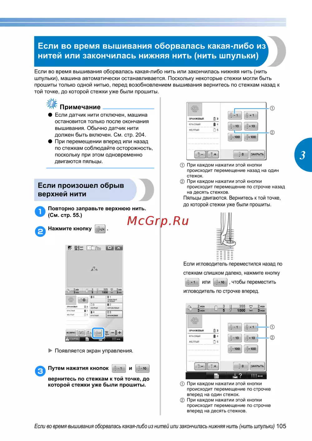 Если во время вышивания оборвалась какая-либо из нитей или закончилась нижняя нить (нить шпульки)