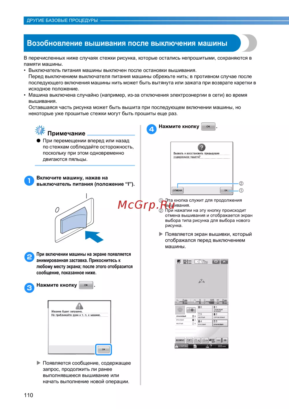 Возобновление вышивания после выключения машины