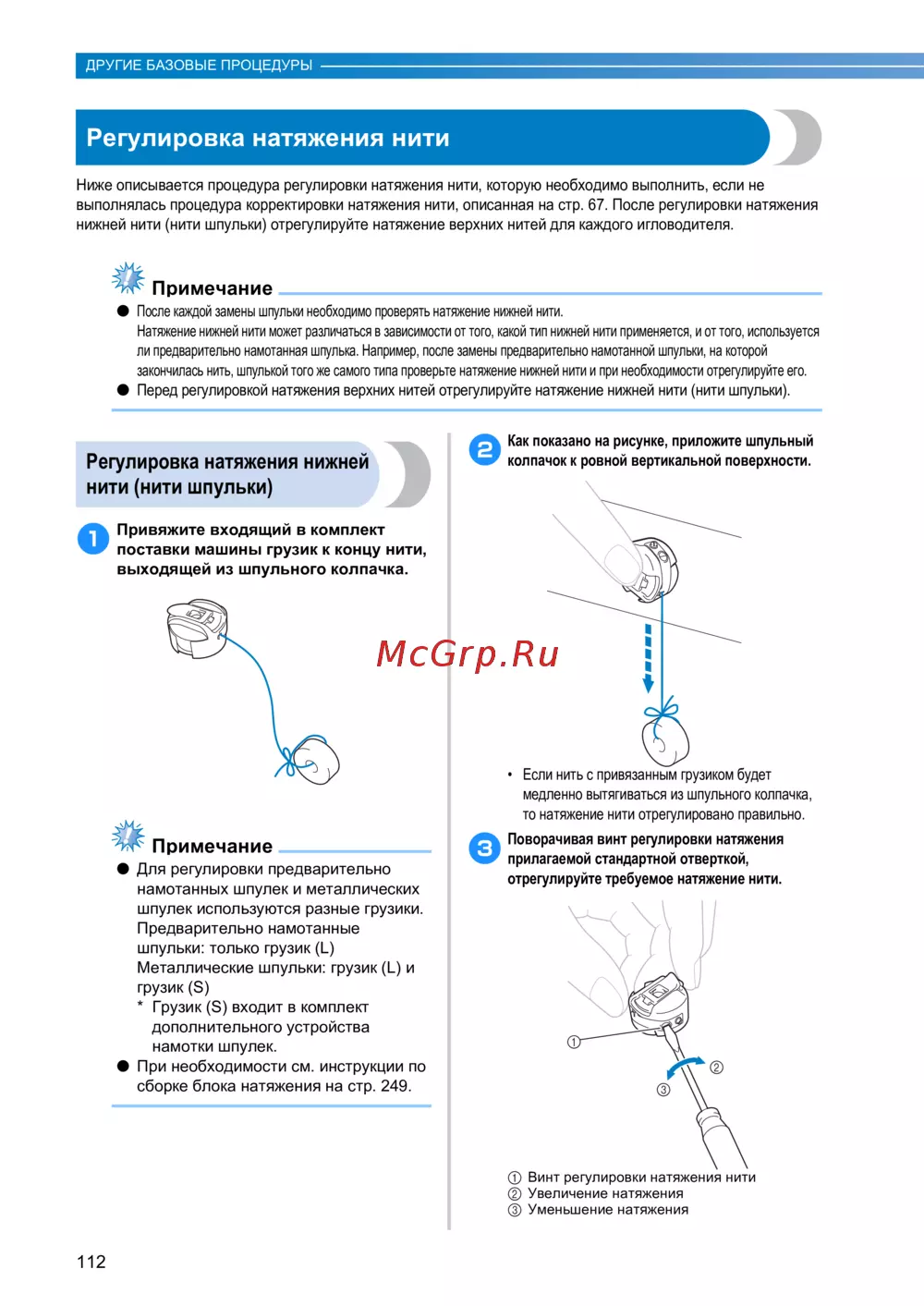 Ниже описывается процедура регулировки натяжения нити, которую необходимо выполнить, если не