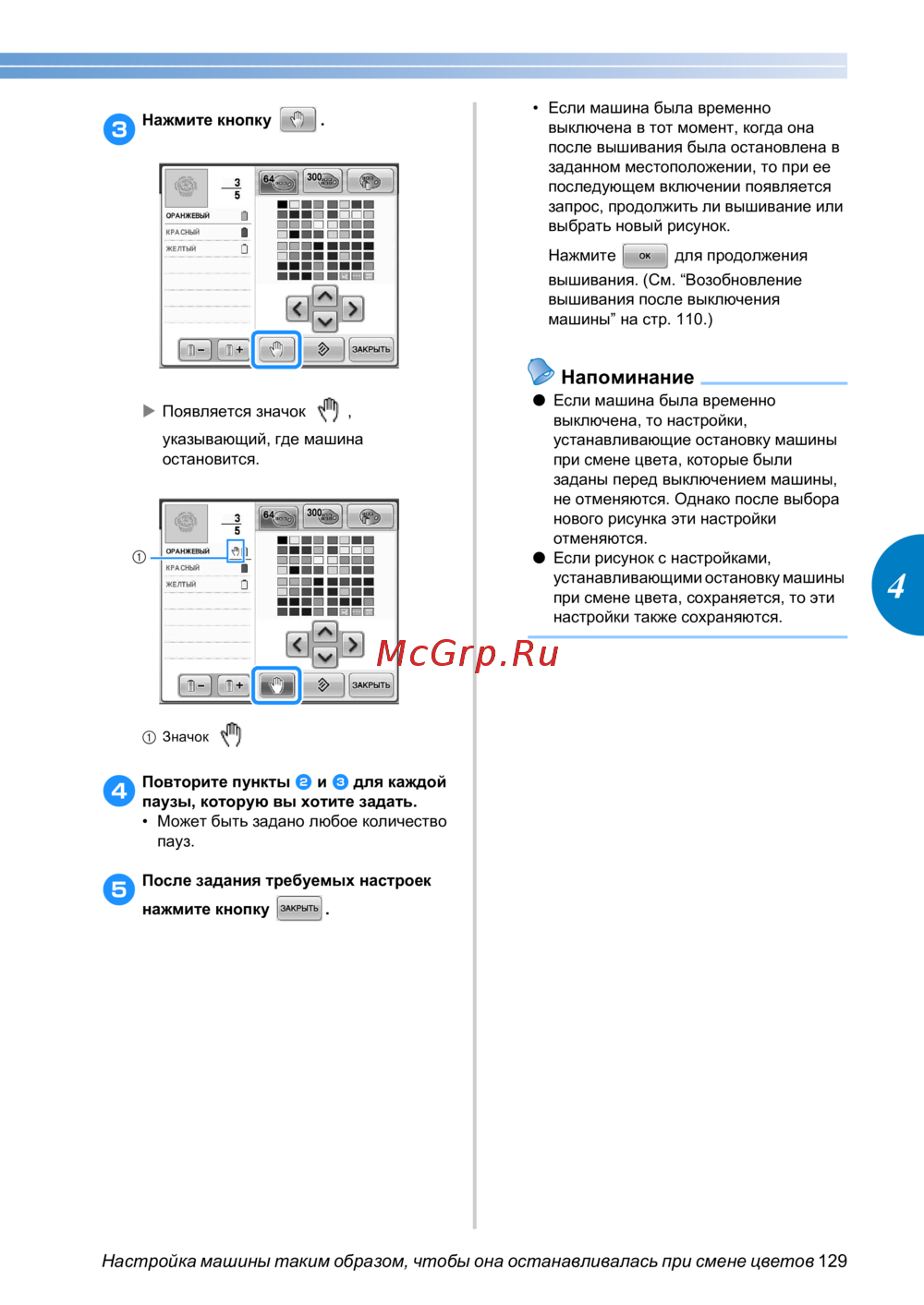 Узнайте, как настроить машину для остановки при смене цветов. Следуйте простым шагам для задания пауз и сохранения настроек вышивания.