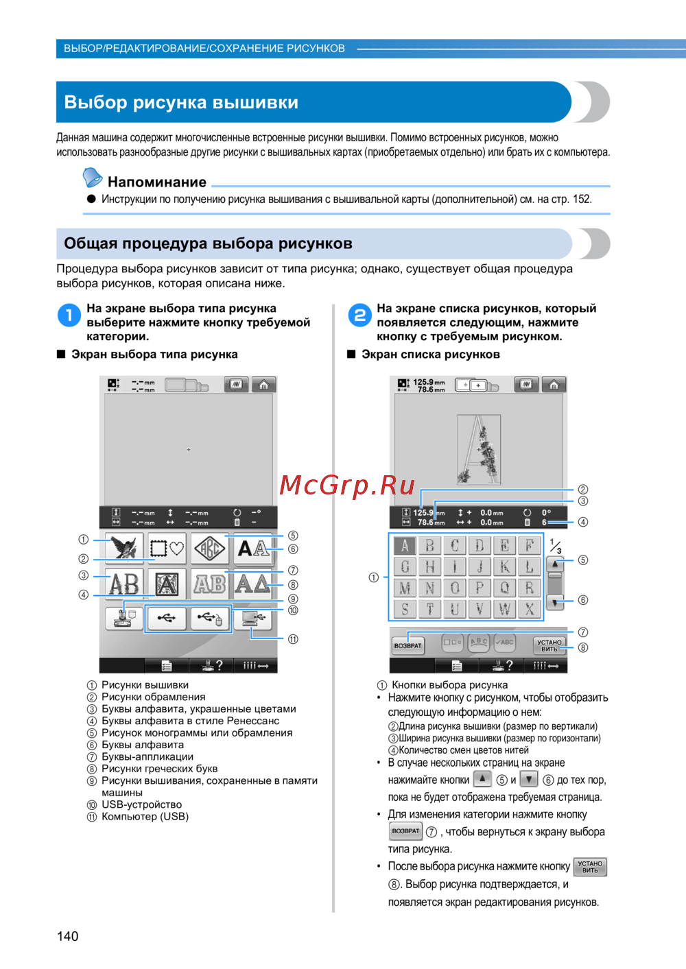 Данная машина содержит многочисленные встроенные рисунки вышивки. Помимо встроенных рисунков, можно