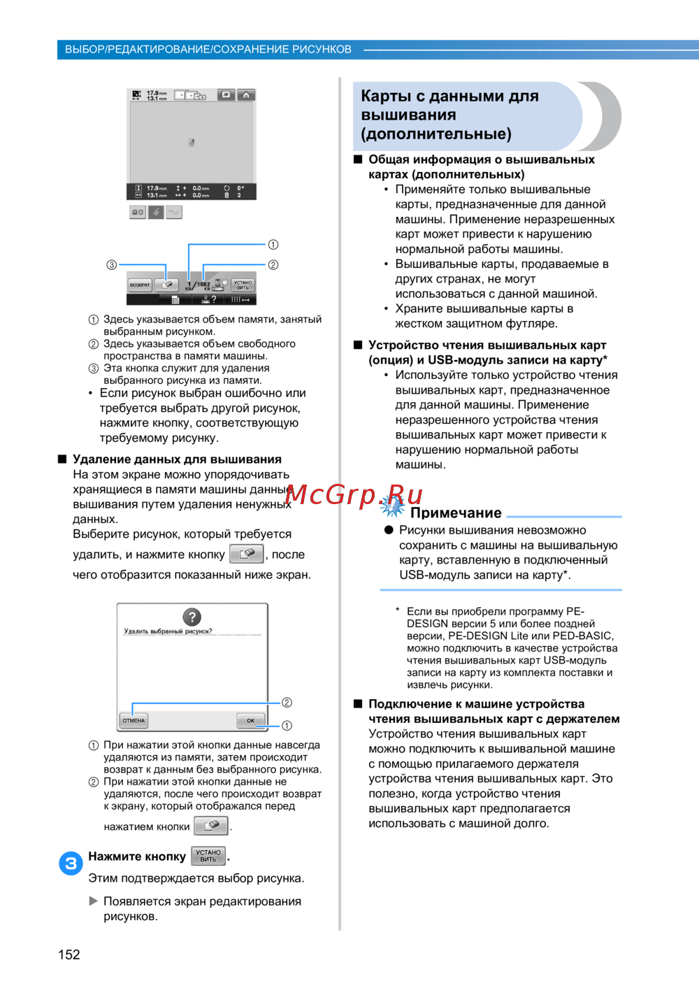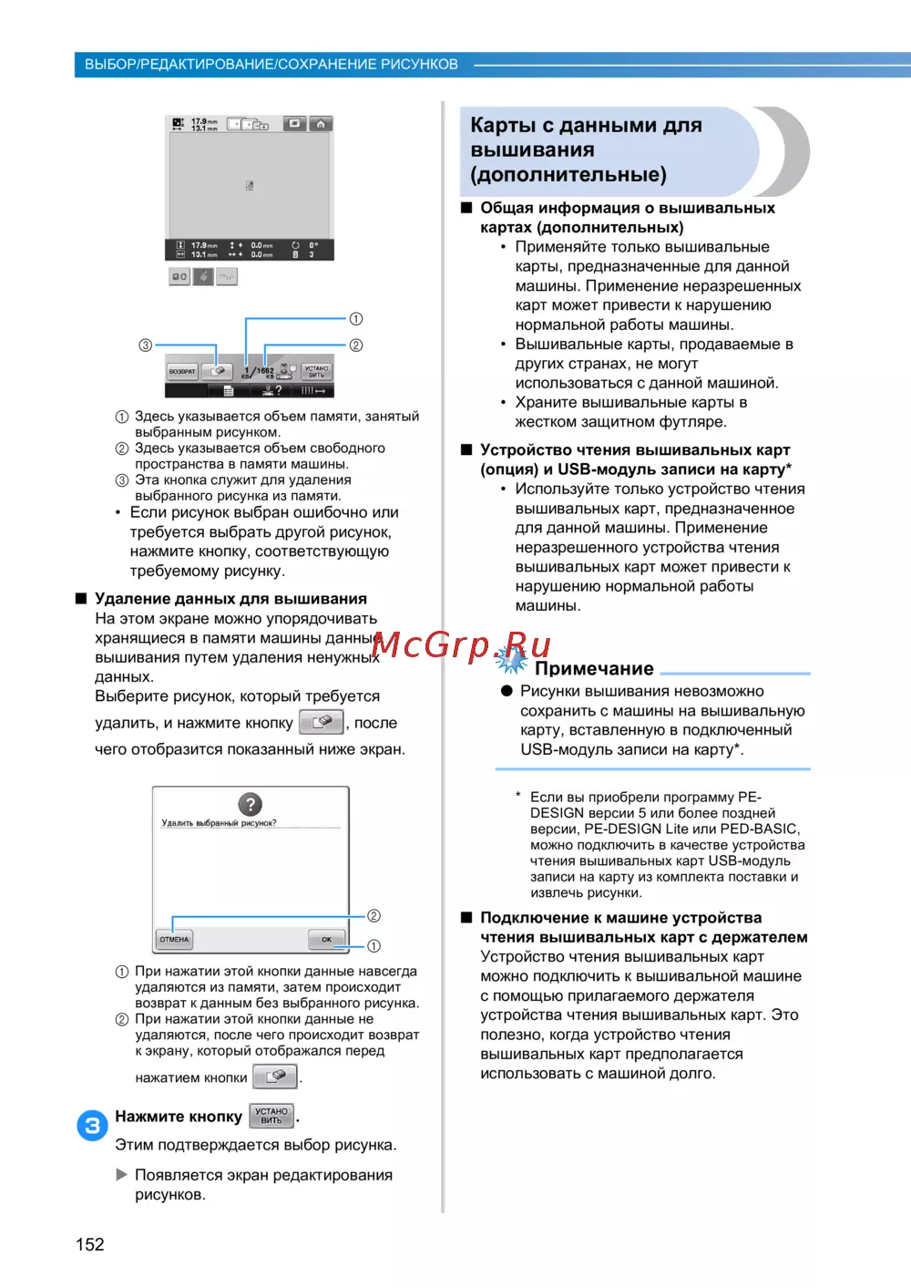 Узнайте, как выбирать, редактировать и сохранять рисунки для вышивания. Удаляйте ненужные данные и используйте только совместимые карты для вашей машины.