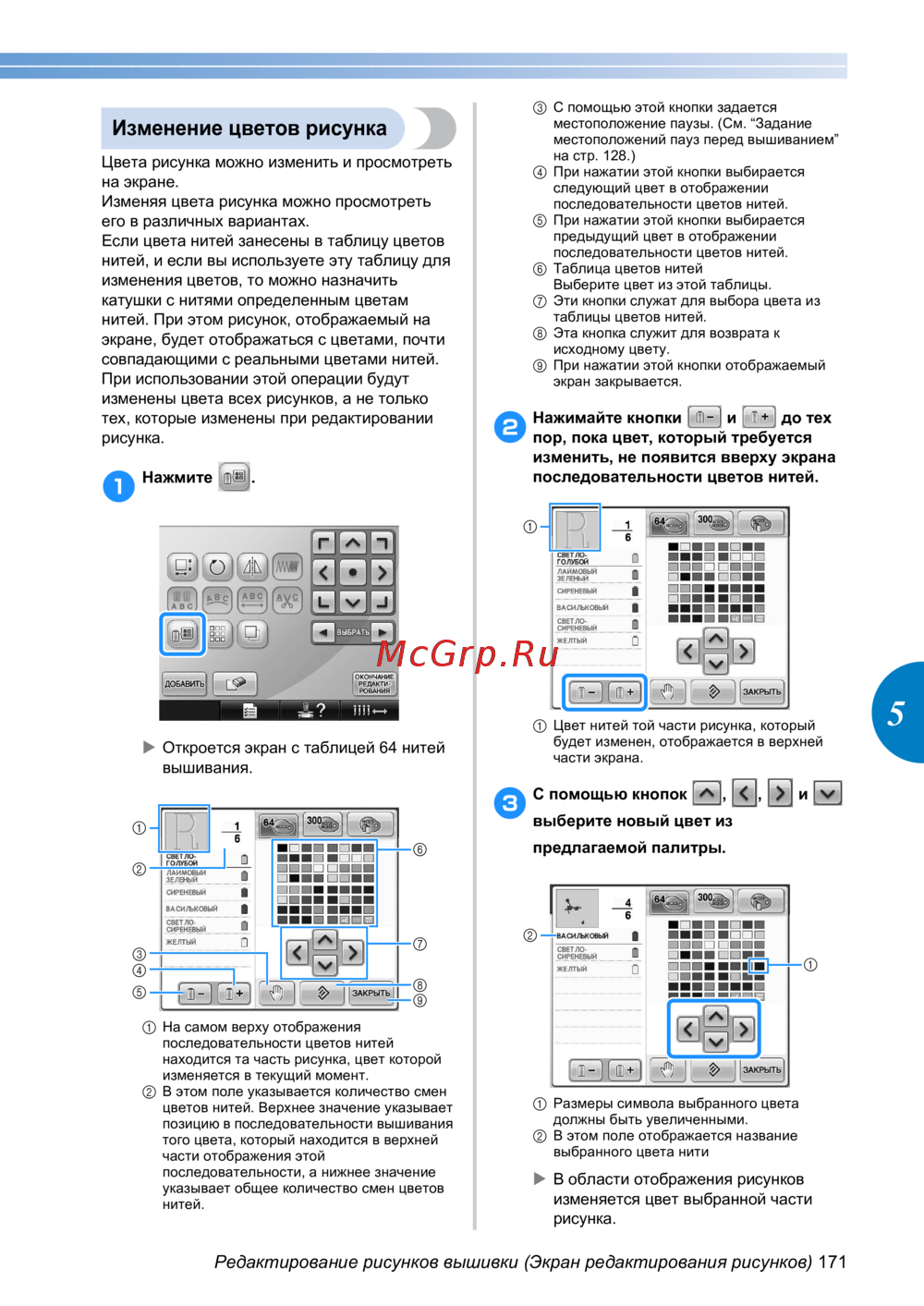 Редактирование рисунков вышивки (Экран редактирования рисунков) 171