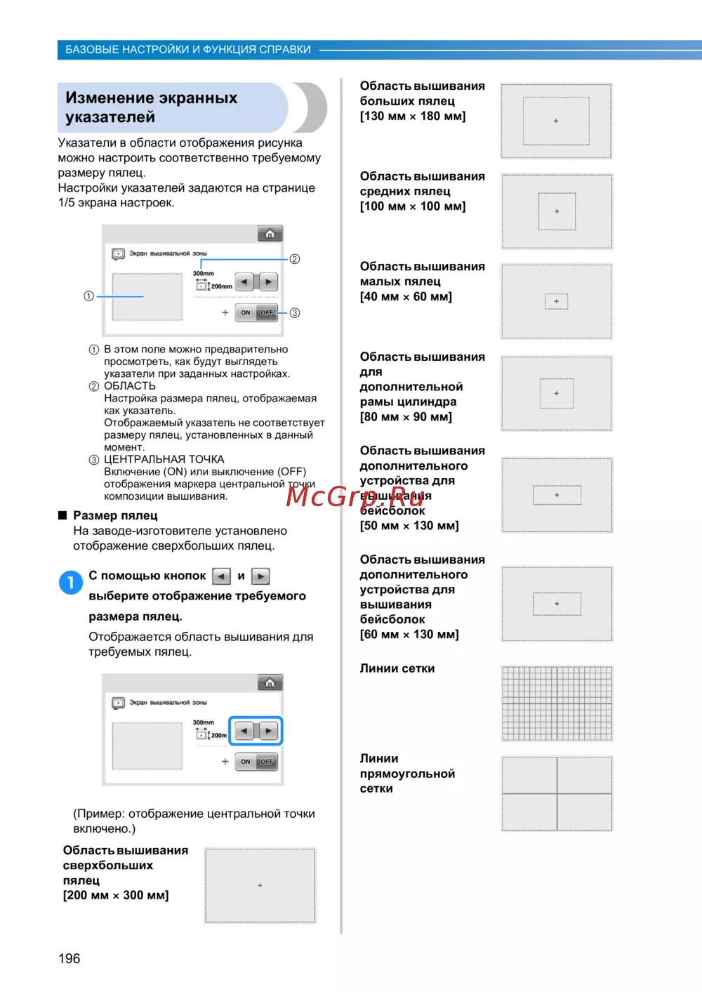 Brother PR650e — настройка экранных указателей и размеров пялец для вышивания [198/280]