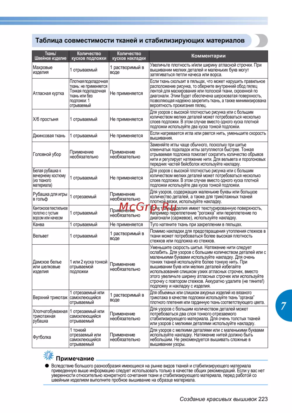 Brother PR650e — рекомендации по вышивке на различных тканях и материалах [225/280]