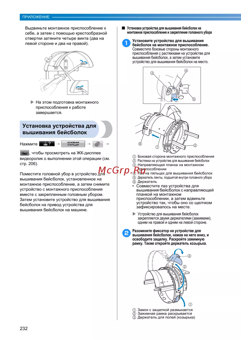 Brother PR650e — установка устройства для вышивания бейсболок: пошаговая инструкция [234/280]