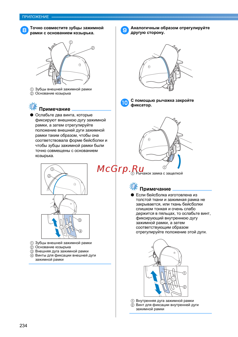Brother PR650e — инструкция по настройке зажимной рамки для бейсболки [236/280]