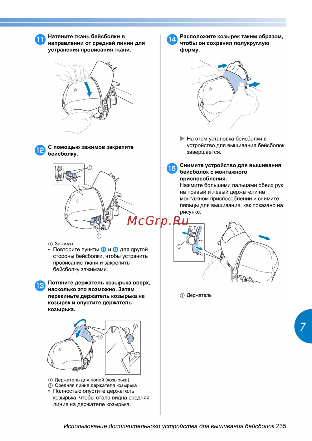 Использование дополнительного устройства для вышивания бейсболок 235