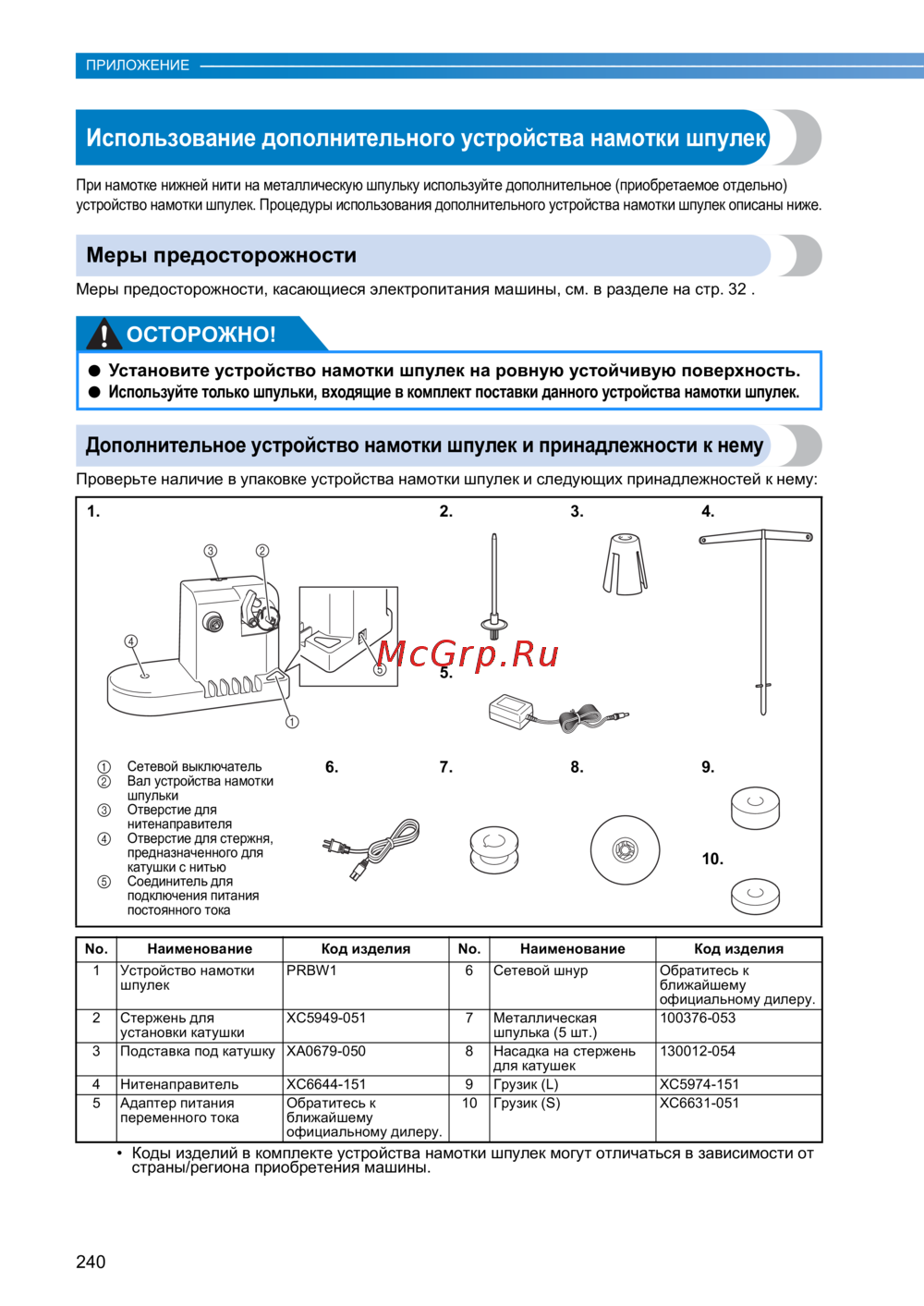 • Коды изделий в комплекте устройства намотки шпулек могут отличаться в зависимости от