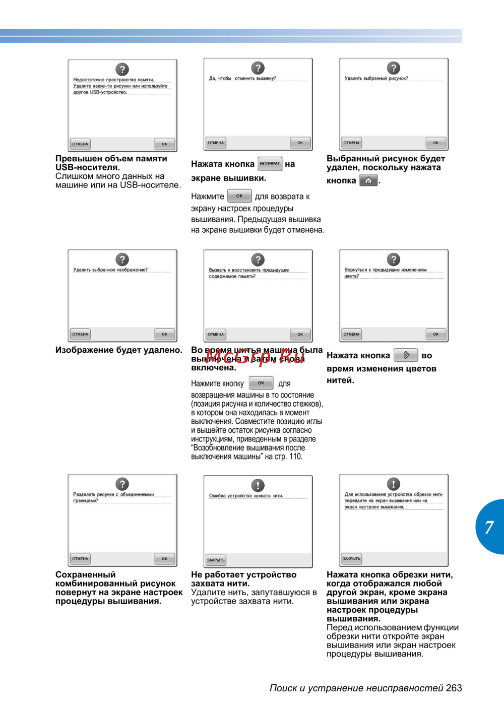 Brother PR650e — поиск и устранение неисправностей при вышивании [265/280]