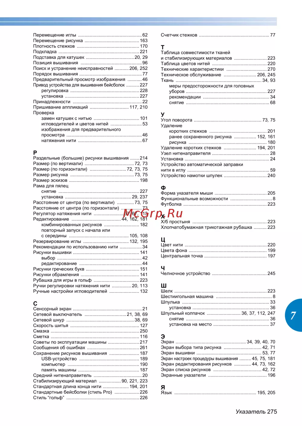 Шпульный колпачок .......................... 36, 37, 112, 247