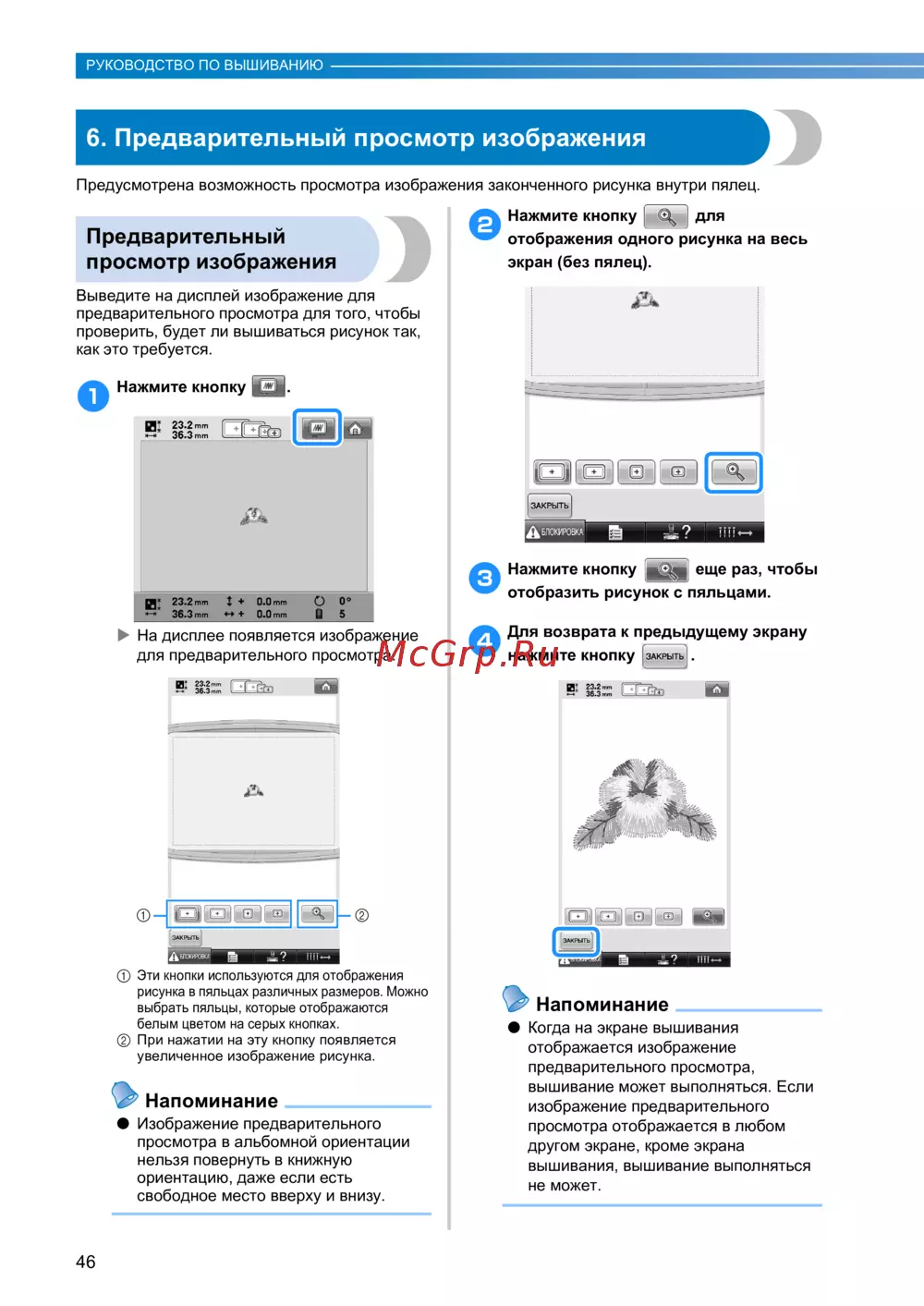 Узнайте, как использовать функцию предварительного просмотра для проверки вышивки. Получите советы по отображению рисунков и настройке пялец.