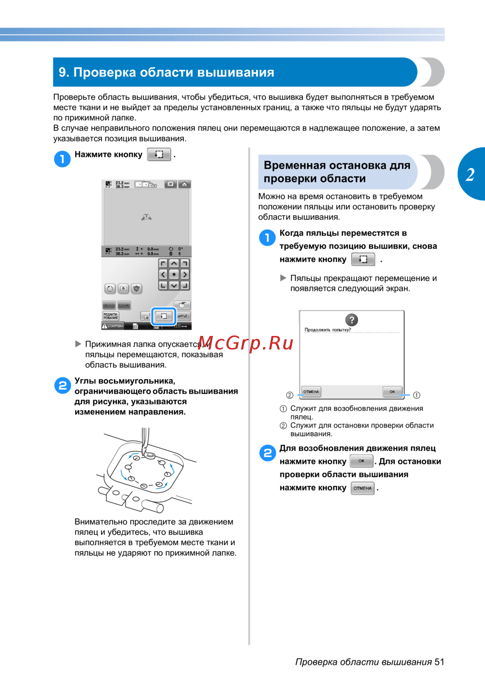 месте ткани и не выйдет за пределы установленных границ, а также что пяльцы не будут ударять
