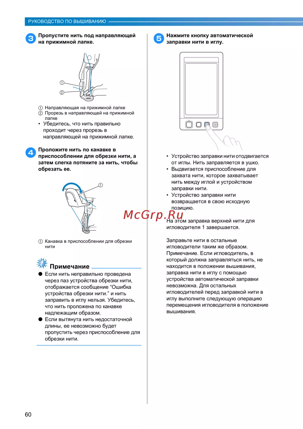 Узнайте, как правильно заправить нить в иглу и использовать устройство для обрезки. Следуйте пошаговым инструкциям для успешного вышивания.
