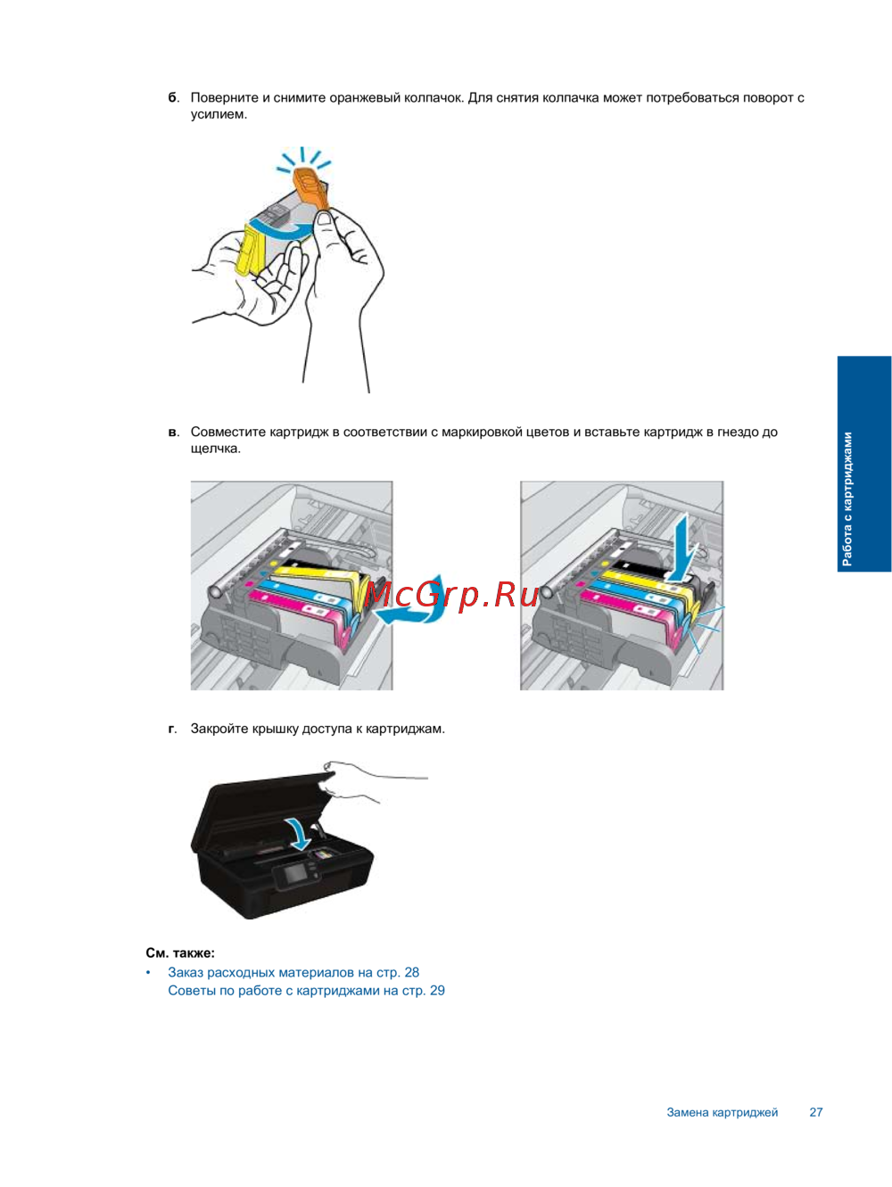 в. Совместите картридж в соответствии с маркировкой цветов и вставьте картридж в гнездо до