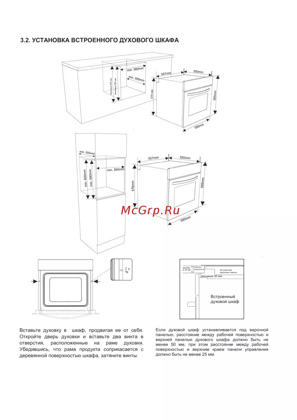3 2 УСТАНОВКА ВСТРОЕННОГО ДУХОВОГО ШКАФА Вставьте духовку в шкаф продвигая ее от себя Откройте дверь духовки и вставьте два винта в отверстия расположенные на раме духовки Убедившись что рама продукта соприкасается с деревянной поверхностью шкафа затяните винты Если духовой шкаф устанавливается под варочной панелью расстояние между рабочей поверхностью и верхней панелью духового шкафа должно быть не менее 50 мм при этом расстояние между рабочей поверхностью и верхним краем панели управления должно быть не менее 25 мм