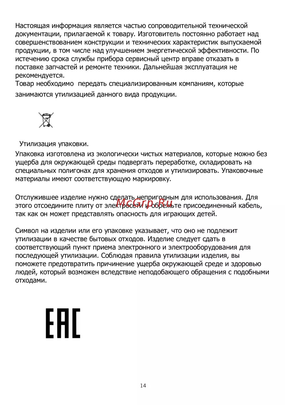 утилизации в качестве бытовых отходов. Изделие следует сдать в