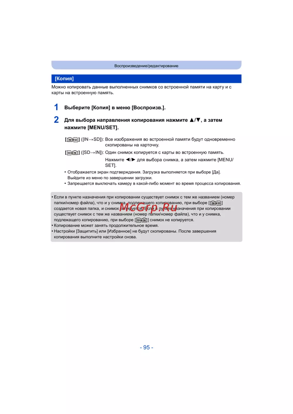 • Запрещается выключать камеру в какой-либо момент во время процесса копирования.