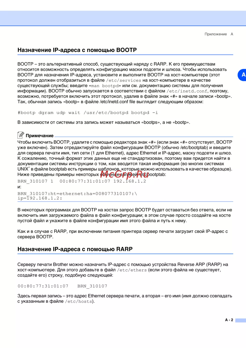 Серверу печати Brother можно назначить IP-адрес с помощью устройства Reverse ARP (RARP) на
