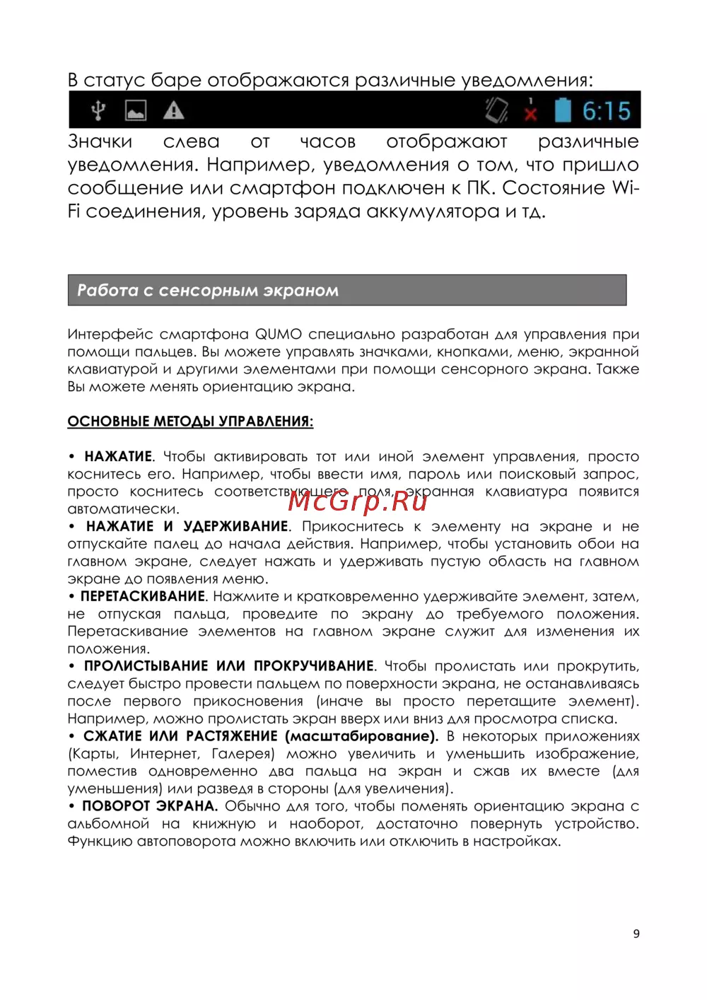 ![Qumo quest 476 white, белый [9/20] Уведомления например уведомления о том что пришло сообщение или смартфон подключен к пк состояние wi fi соединения уровень заряда аккумулятора и тд](/views2/1178257/page9/bg9.png)
