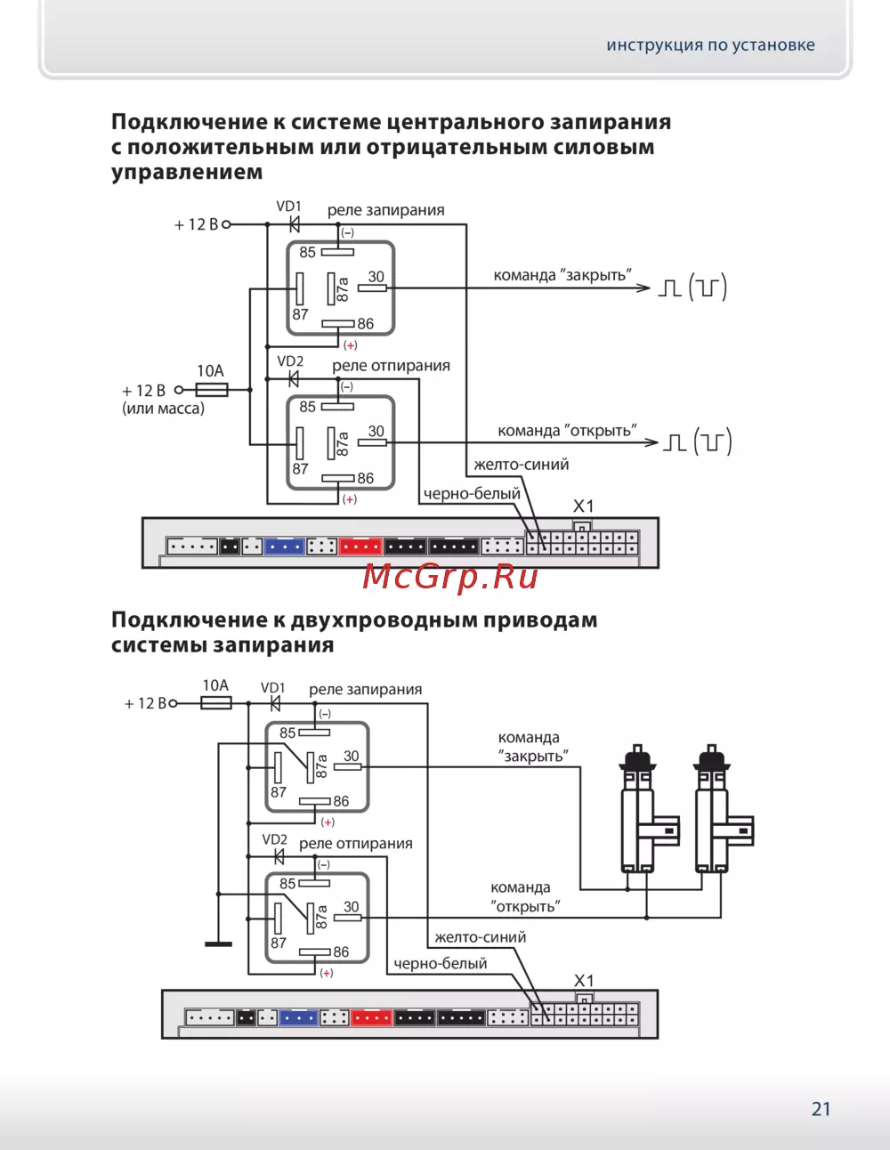 - Подключение к системе центрального запирания с отрицательным слаботочным управлением p.20