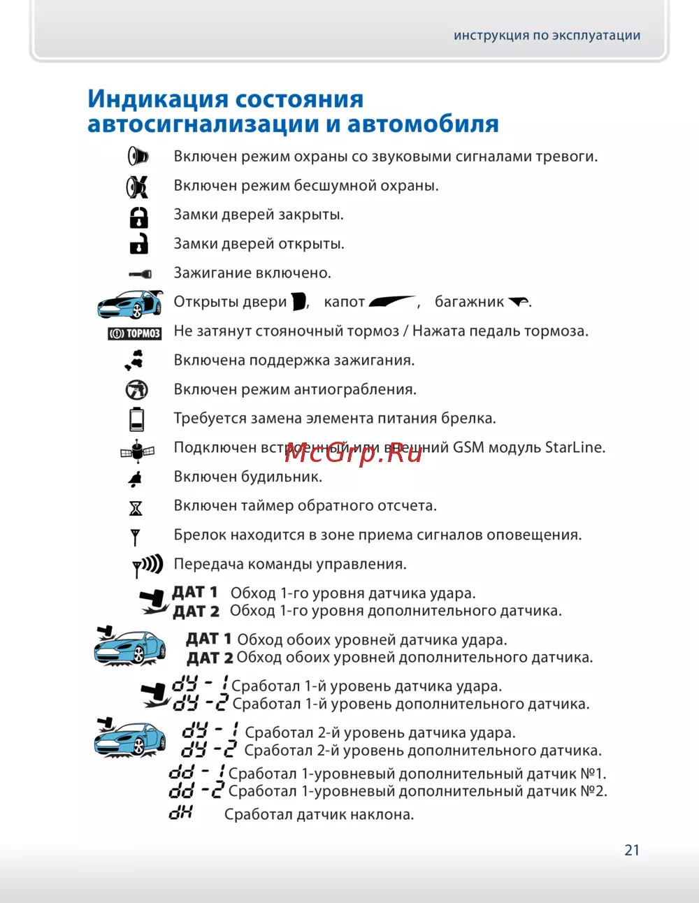 - Индикация состояния автосигнализации и автомобиля p.21