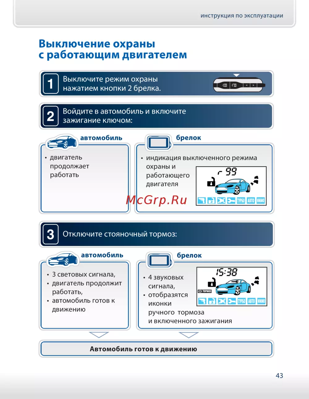 - С помощью штатного брелка управления или другим штатным способом переведите штатную охранную систему автомобиля в состояние охрана выключена p.90