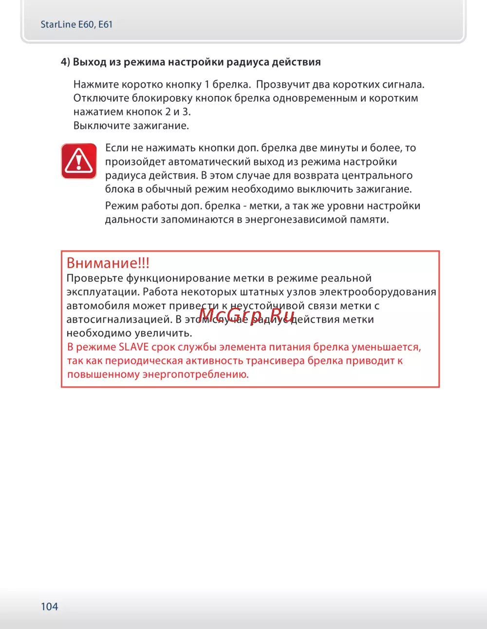 - Автомобиля может привести к неустойчивой связи метки с автосигнализацией в этом случае радиус действия метки необходимо увеличить p.104