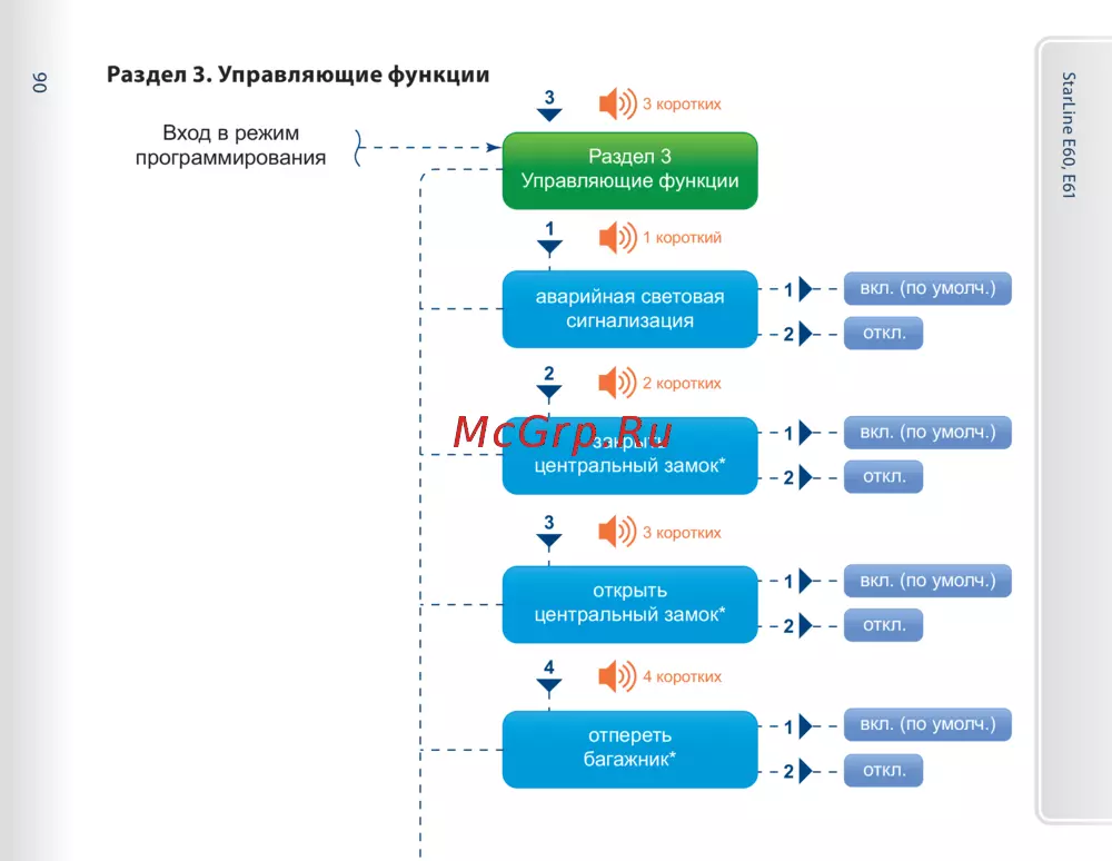 - Нажмите 2 раза кнопку 3 брелка первое нажатие длительное до звукового сигнала второе коротко p.117