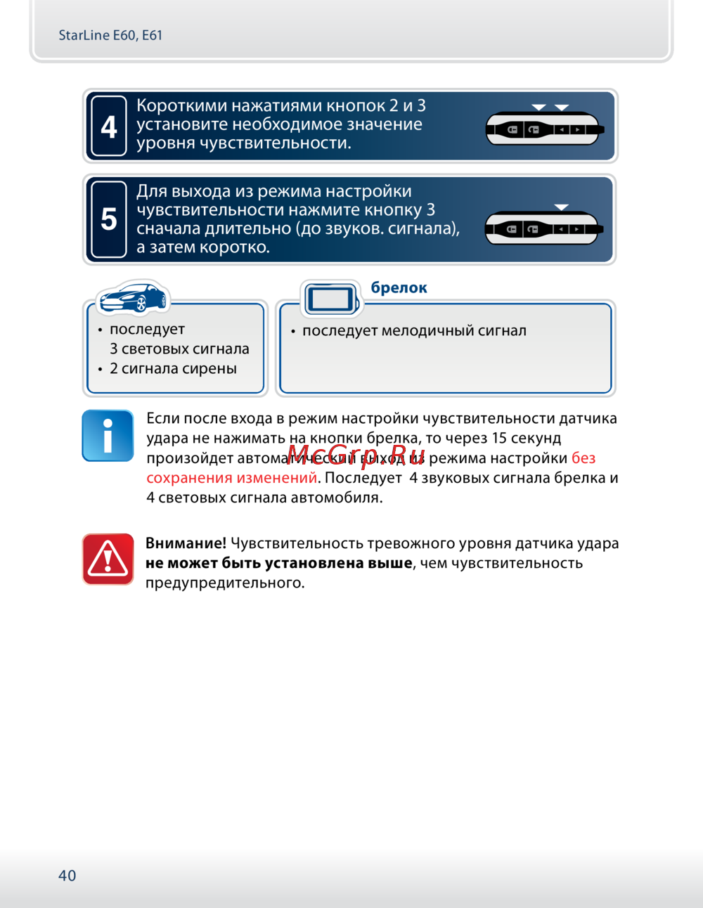 - Каждое нажатие штатной кнопки сигнализация подтвердит однократным сигналом сирены p.111