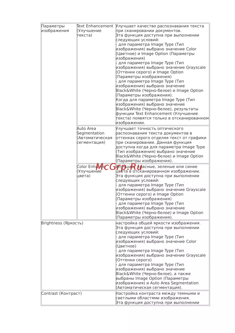 Узнайте о функциях улучшения качества изображений, таких как улучшение текста, яркости и контраста, доступных для различных типов изображений при сканировании.