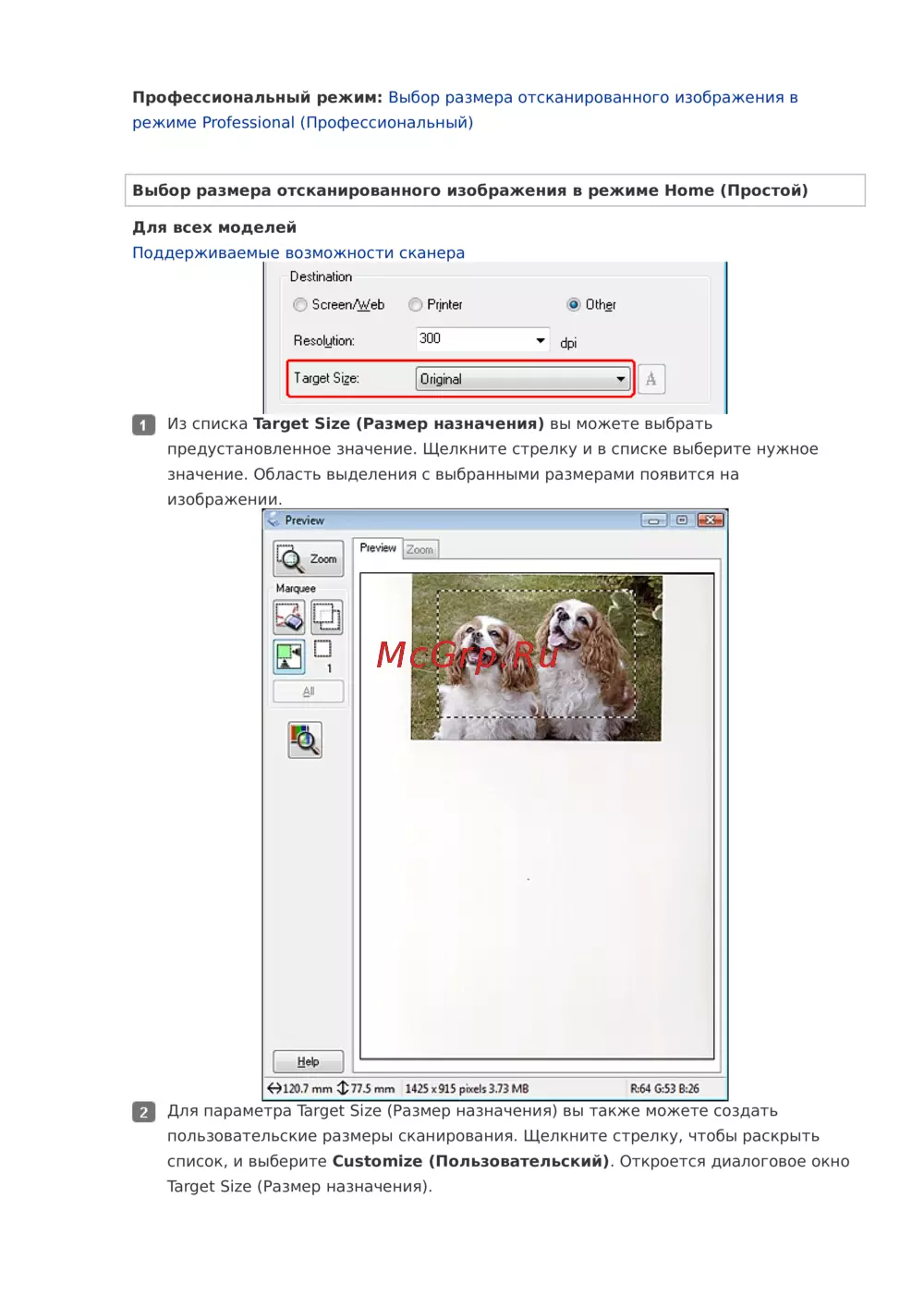 Профессиональный режим: Выбор размера отсканированного изображения в