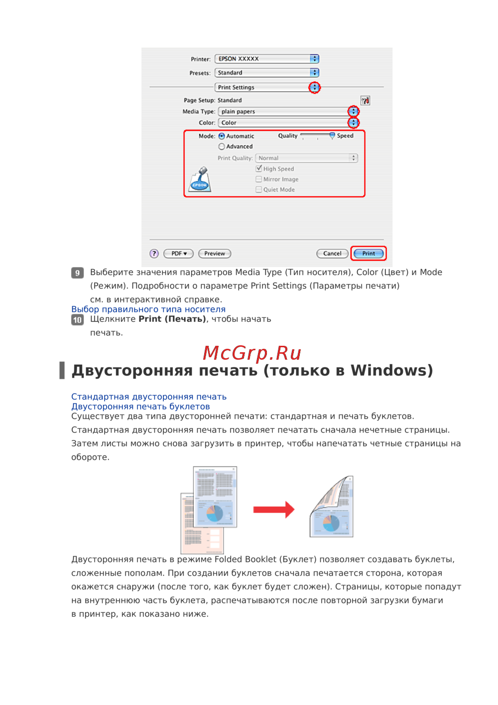 Существует два типа двусторонней печати: стандартная и печать буклетов.