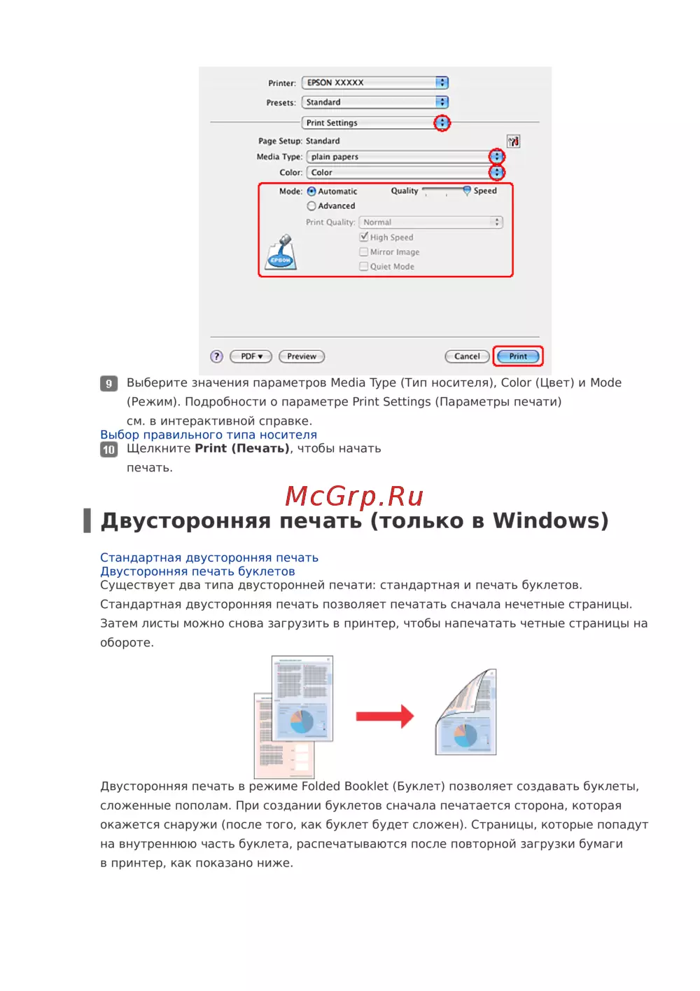 Инструкция по выбору параметров печати, включая тип носителя, цвет, режим и особенности двусторонней печати и создания буклетов.