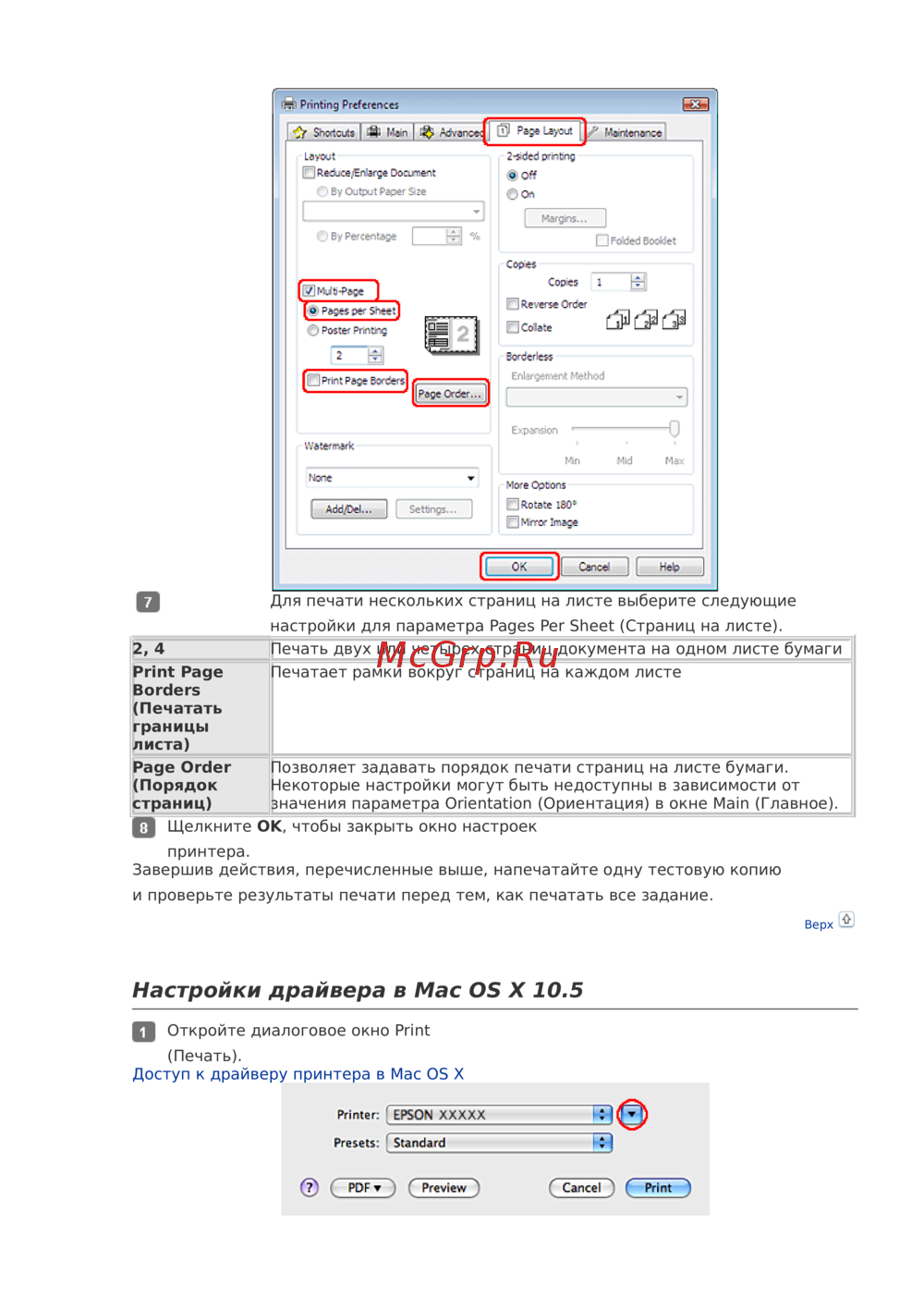 2, 4 Печать двух или четырех страниц документа на одном листе бумаги