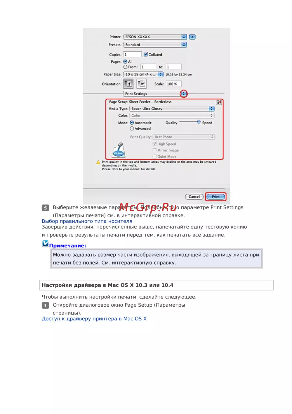 Настройки драйвера в Mac OS X 10.3 или 10.4