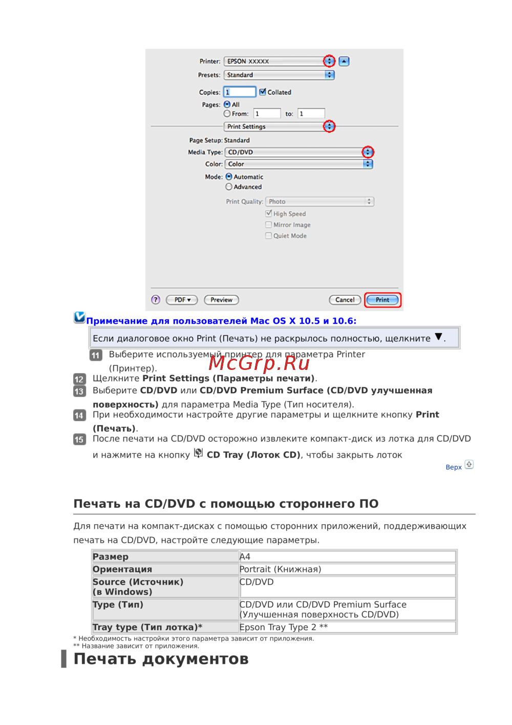 Примечание для пользователей Mac OS X 10.5 и 10.6: