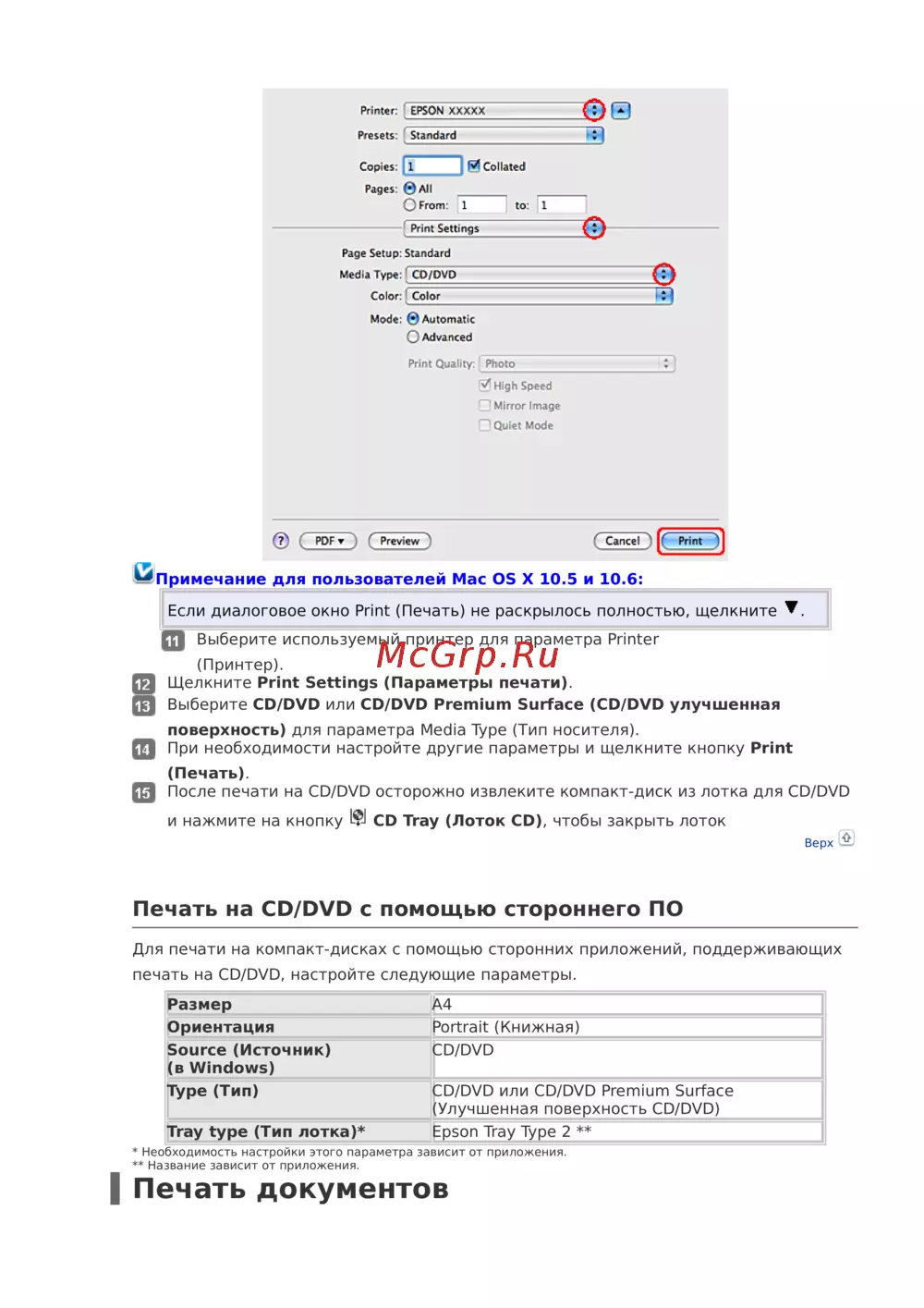 Для печати на компакт-дисках с помощью сторонних приложений, поддерживающих