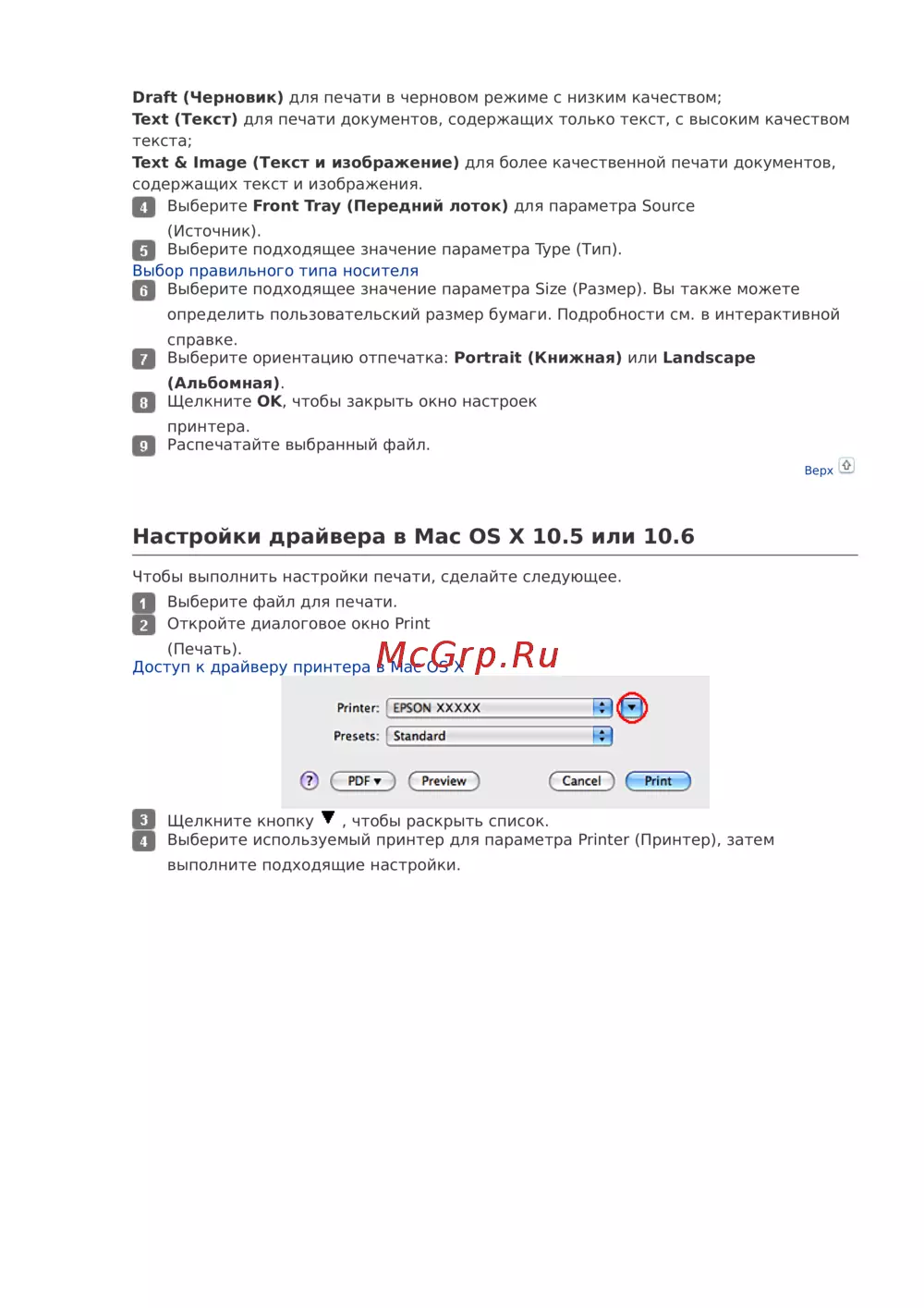 Настройки драйвера в Mac OS X 10.5 или 10.6