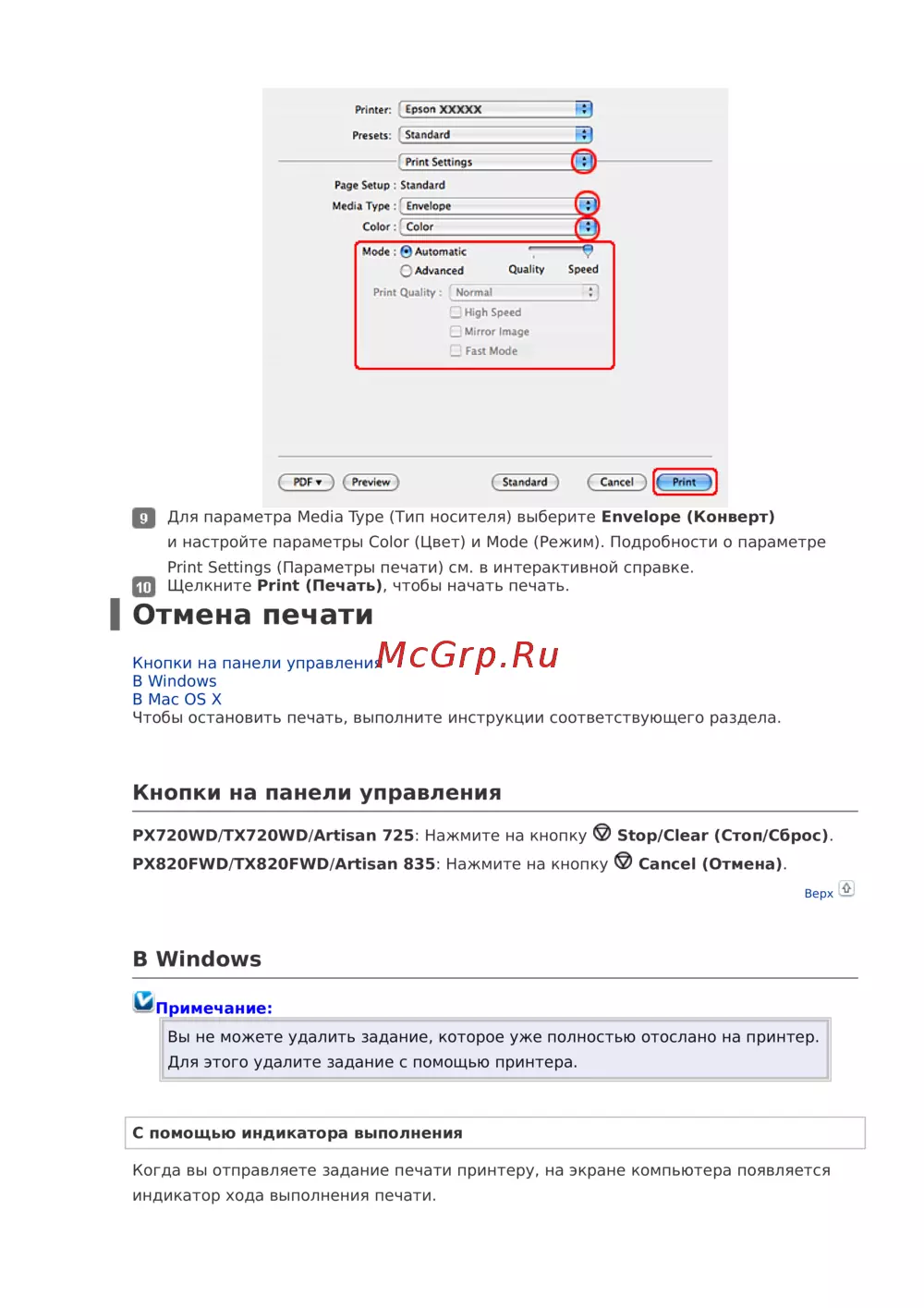 Чтобы остановить печать, выполните инструкции соответствующего раздела.