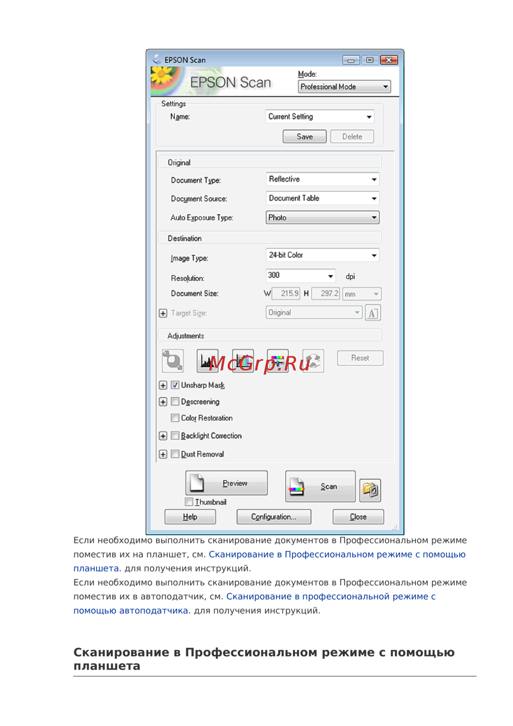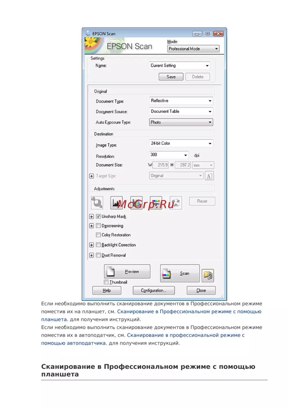 Если необходимо выполнить сканирование документов в Профессиональном режиме